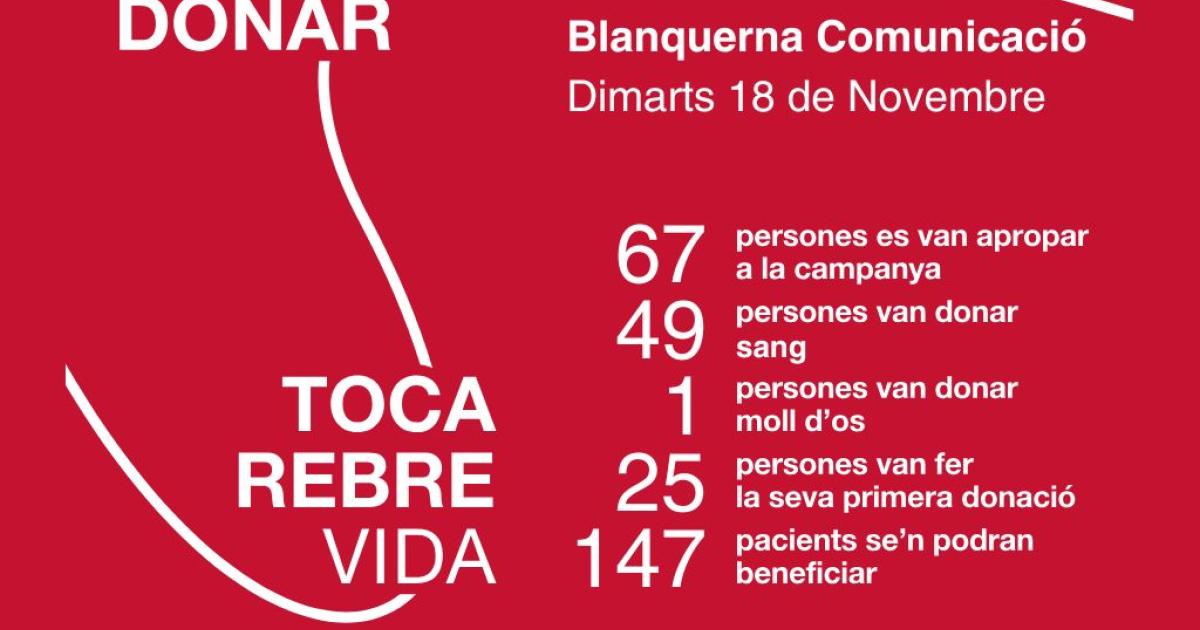 Amb un total de 67 persones que es van apropar a la campanya, la iniciativa va registrar 49 donants de sang, 25 de les quals era la seva primera vegada, i 1 persona va donar moll d’os. Gràcies al Banc de Sang i Teixits, la jornada aconseguirà que 147 pacients se’n puguin beneficiar.