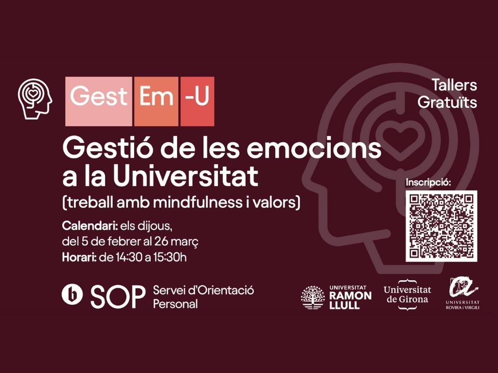 Entre les propostes d’aquest curs s’hi inclouen el programa GestEm-U, el taller de Gestió de les emocions a la universitat, el de Relaxació de Jacobson, el d’Estratègies d’aprenentatge i el de Gestió de les emocions en moviment, amb formats presencials i en línia.