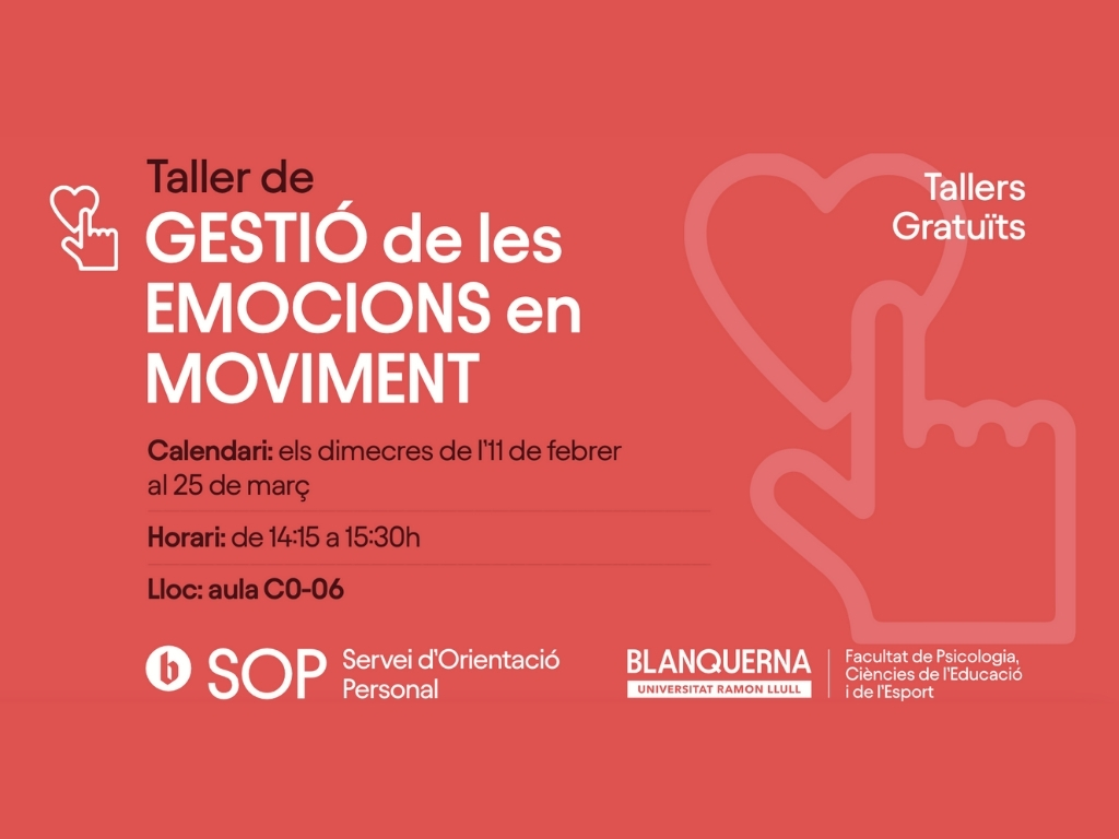 El Servei d’Orientació Personal (SOP) de la Fundació Blanquerna posa a disposició de la comunitat universitària diferents tallers orientats al benestar emocional, l’autoconeixement i l’aprenentatge adreçats a estudiants, PDI i PTGAS.