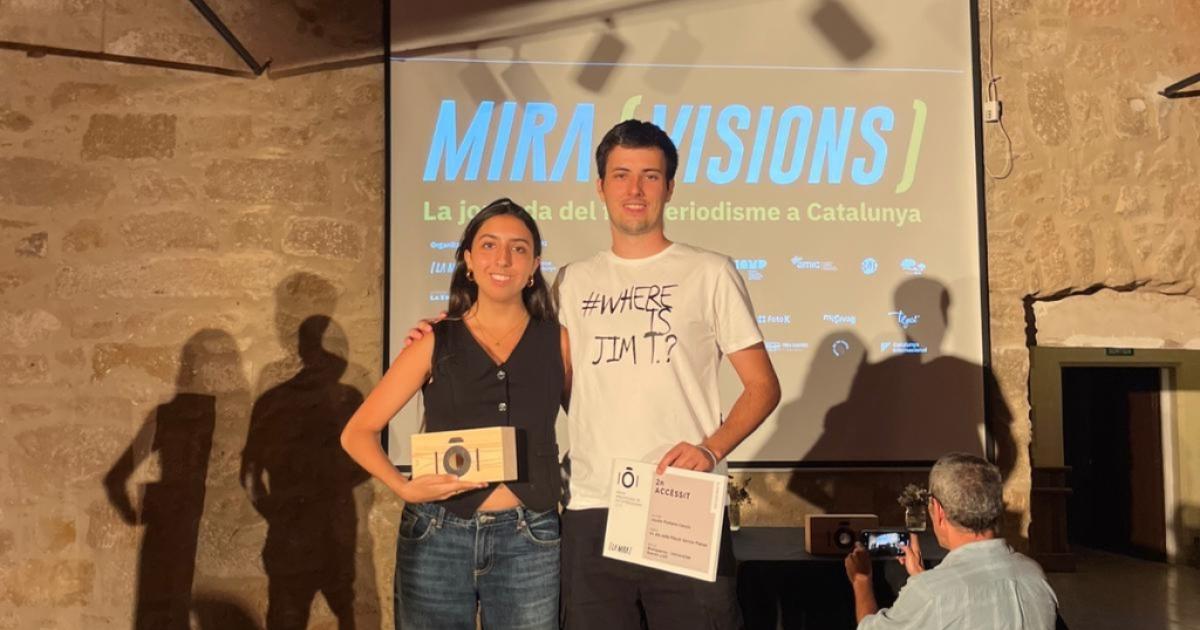 El passat dissabte, 27 de setembre, es va celebrar l’entrega dels Premis Miravisions de Fotoperiodisme. En la categoria d’estudiants van ser guardonats Nadia Arboix, alumna de 4t curs del grau en Periodisme i Comunicació Corporativa, per ScorpioAngel, i Jaume Prohens, alumni del mateix grau (promoció 2025), per Un dia amb Plàcid Garcia-Planas.
