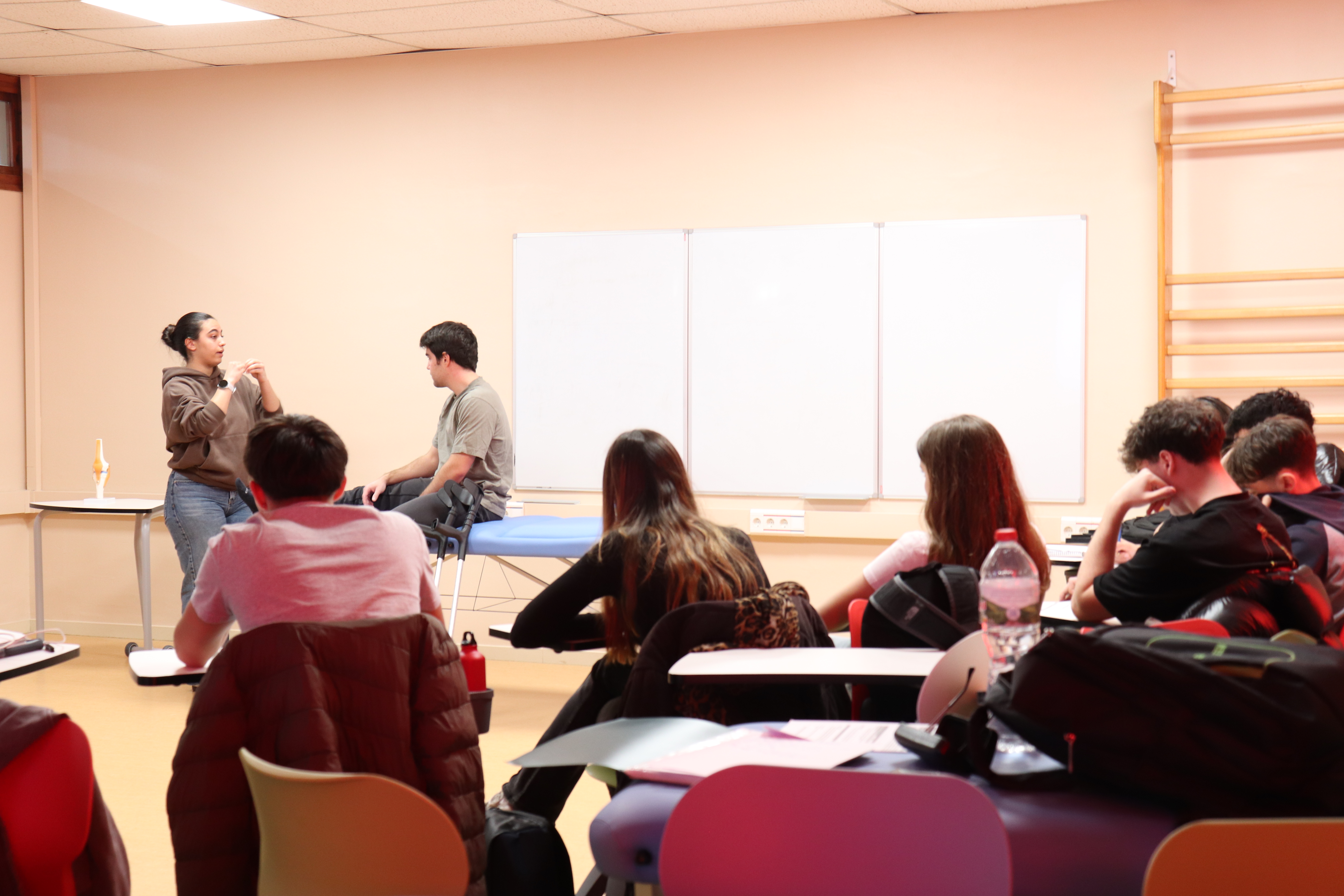 L’escenari s’ha situat en un cantó de l’aula, fet que ha permès una visualització en directe i en proximitat. Aquest plantejament ha afavorit una experiència més immersiva, en què l’alumnat ha pogut observar de manera detallada el desenvolupament del cas, la comunicació i la presa de decisions.