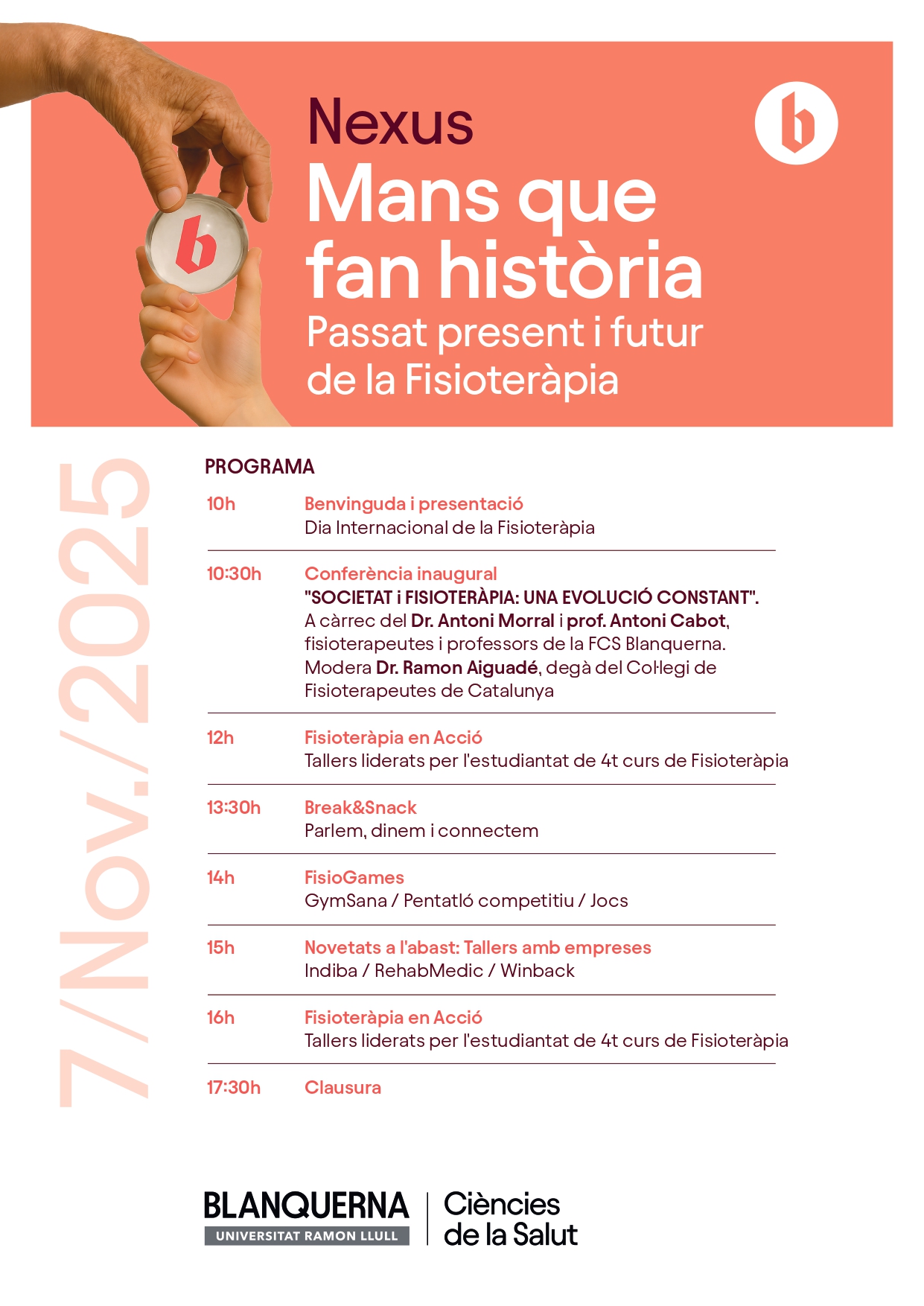 El divendres 7 de novembre propvinent tindrà lloc una nova sessió de NEXUS BQN, que estarà centrada en el grau en Fisioteràpia, amb el títol “Mans que fan història. Passat, present i futur de la Fisioteràpia”. La jornada coincidirà amb la celebració del Dia Internacional de la Fisioteràpia i proposarà un recorregut pel passat, el present i el futur d’aquesta disciplina, tot destacant el paper fonamental dels professionals del sector en la societat actual.