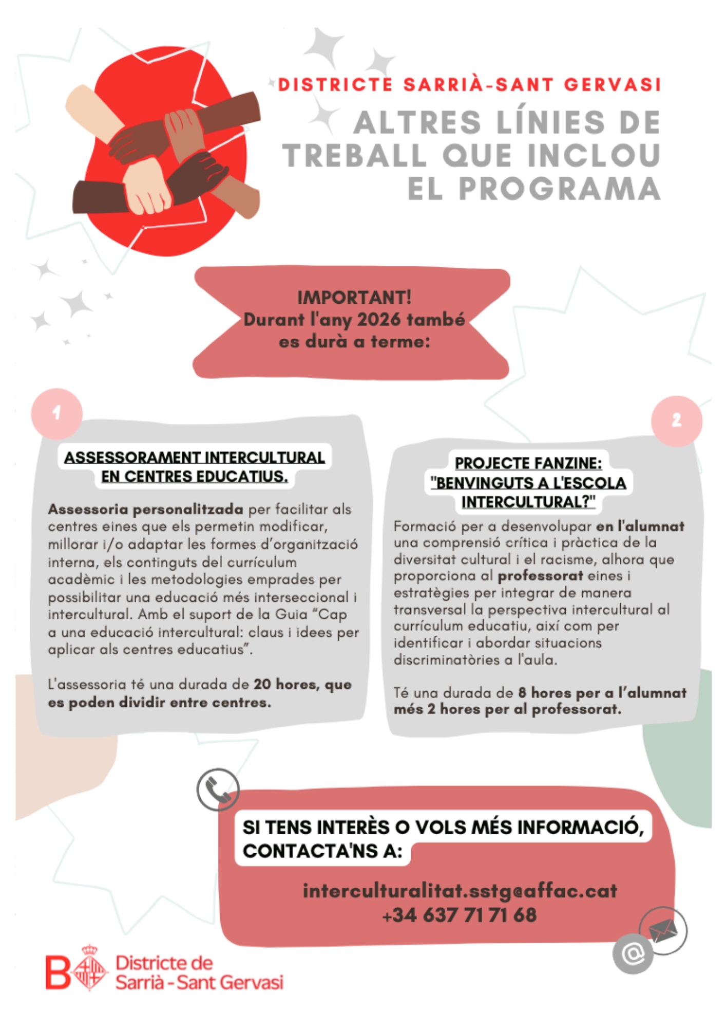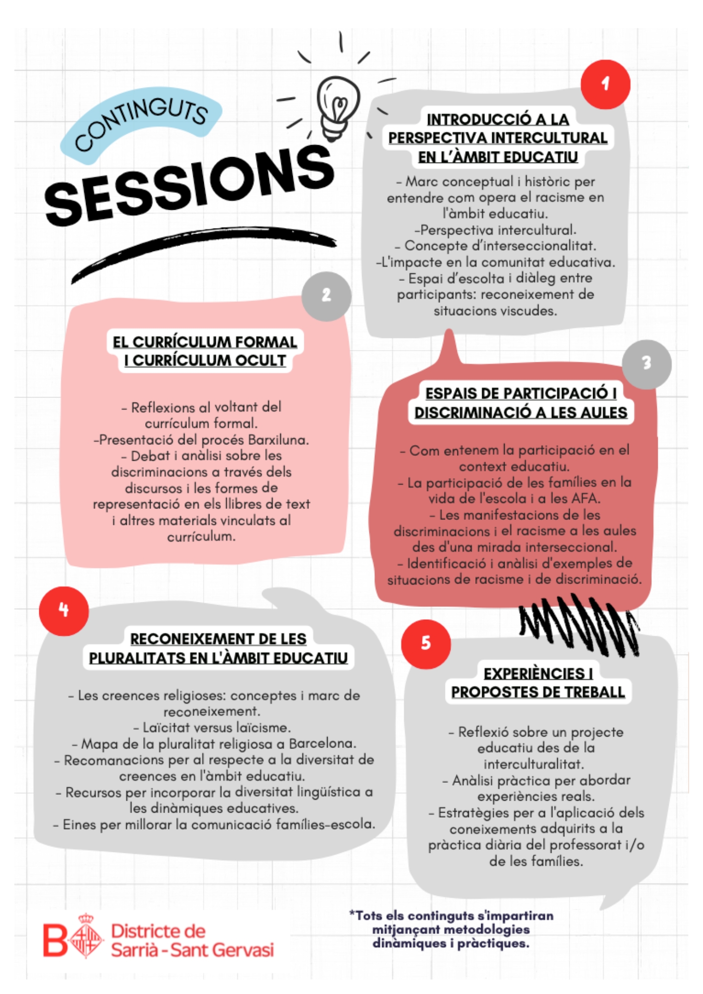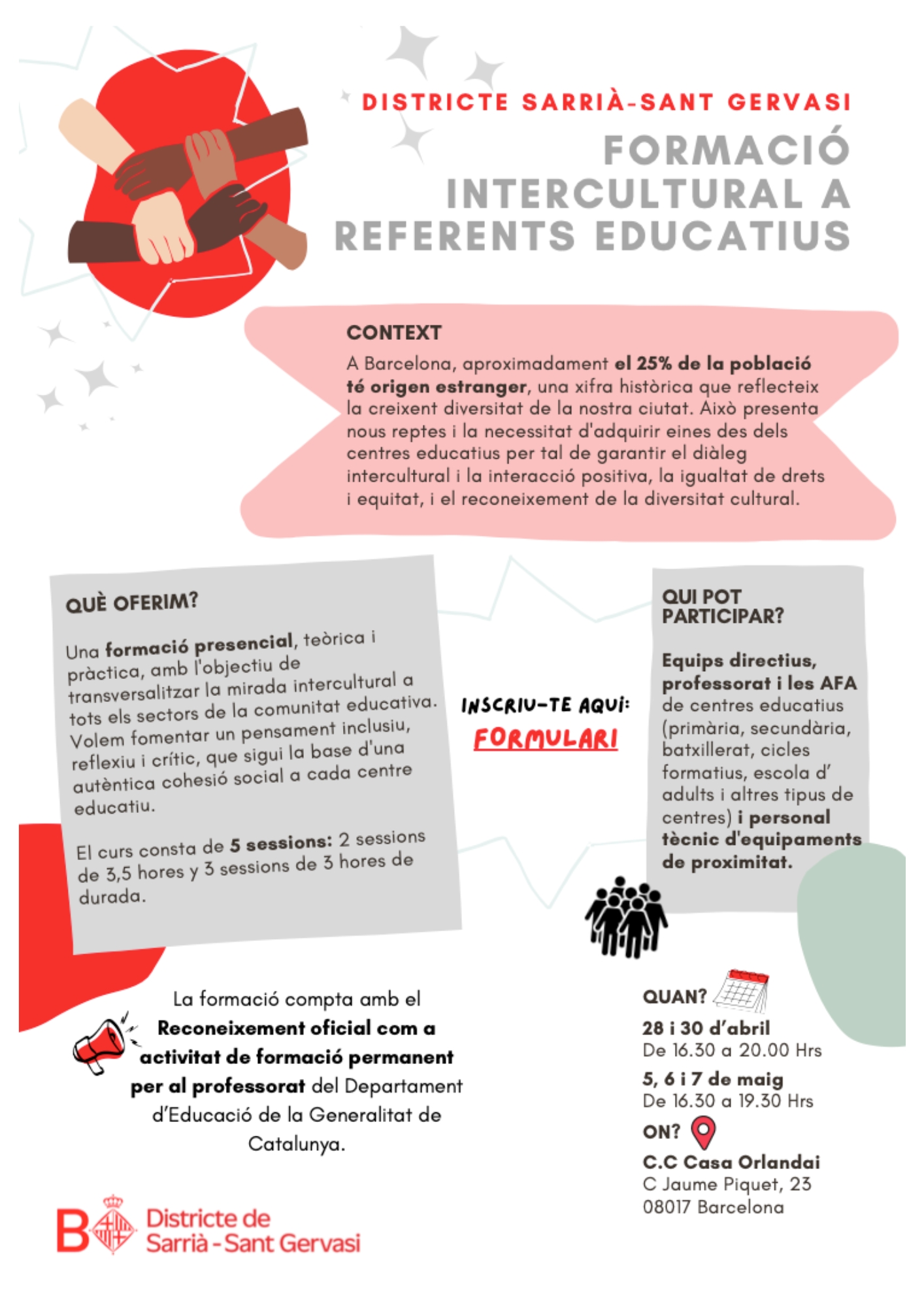 Aquesta serà la darrera edició de la formació i, a més, compta amb el reconeixement del Departament d’Educació per al professorat. Creiem que és una molt bona oportunitat per guanyar eines pràctiques, compartir reflexions i reforçar una mirada educativa intercultural als vostres centres i espais de referència.