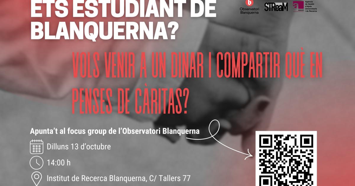Si ets estudiant de Blanquerna (URL) pots participar en el projecte formant part del focus group que es farà a l’Institut de Recerca Blanquerna el dia 13 d’octubre a les 14 h. Vine a dinar amb nosaltres i compareix el que coneixes de Càritas!