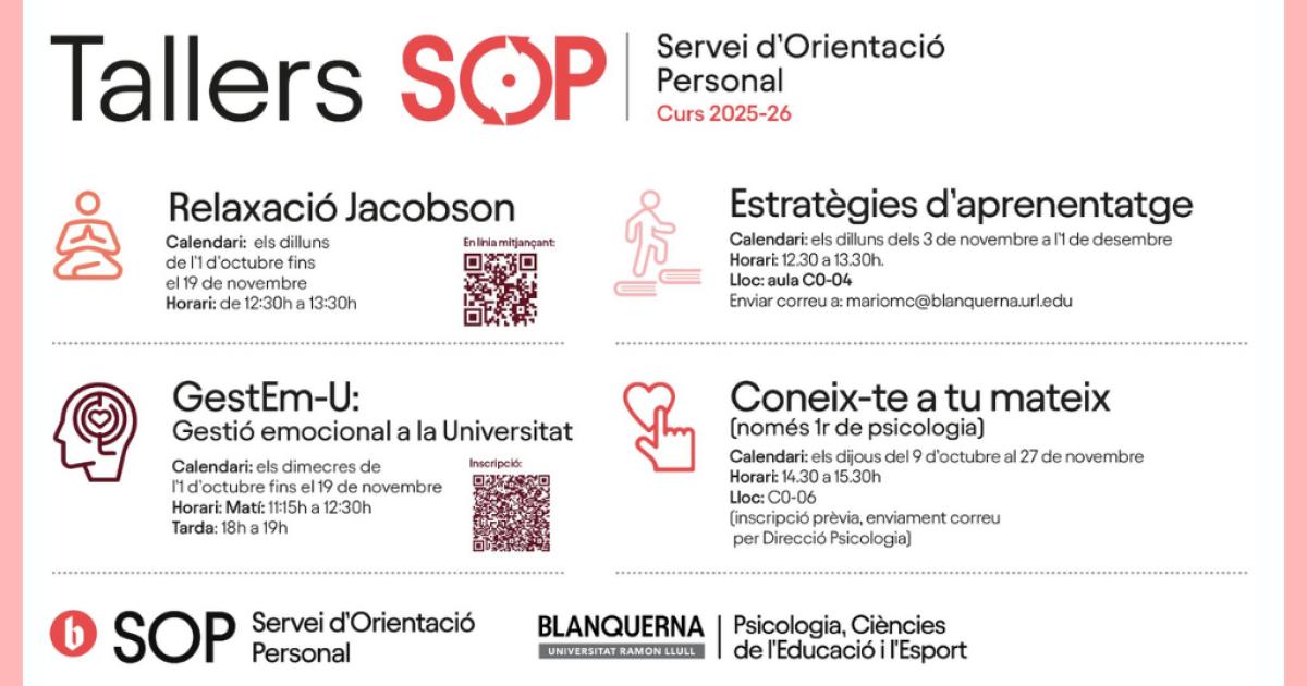 Este semestre, todo el PAS, el profesorado y el estudiantado de Blanquerna-URL podréis disfrutar de los talleres SOP de forma gratuita.